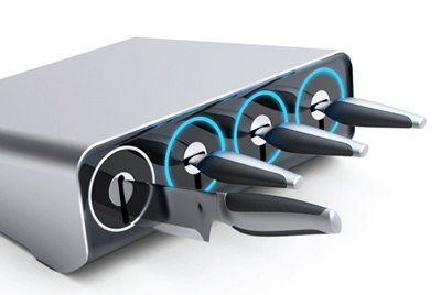 Корейский дизайнер Min Seong Kim изобрёл устройство для хранения ножей, которое не только делает их недоступными для детей, но и стерилизует. Для надёжной фиксации внутри паза нож следует повернуть против часовой стрелки на 270 градусов. В этом положении он прочно удерживается до тех пор, пока не закончится его стерилизация ультрафиолетовыми лучами. По окончании стерилизации нож можно вынуть, повернув его в противоположную сторону на 270 градусов.