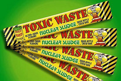 В Пакистане выпущены жевательные конфеты с вишнёвым вкусом под названием 'Toxic Waste Nuclear Sludge', что означает «токсические радиоактивные отходы». Как показал анализ этих сладостей, проведенный управлением здравоохранения Калифорнии, название – это не просто рекламный ход, но и довольно правдивая характеристика продукта. Количество свинца в этих конфетах превысило допустимую норму в 20 раз. Употреблять их в пищу, особенно детям, не рекомендуется.